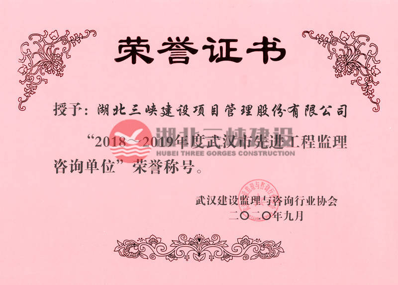 “2018~2019年度武漢市先進工程監(jiān)理咨詢單位”榮譽稱號 |