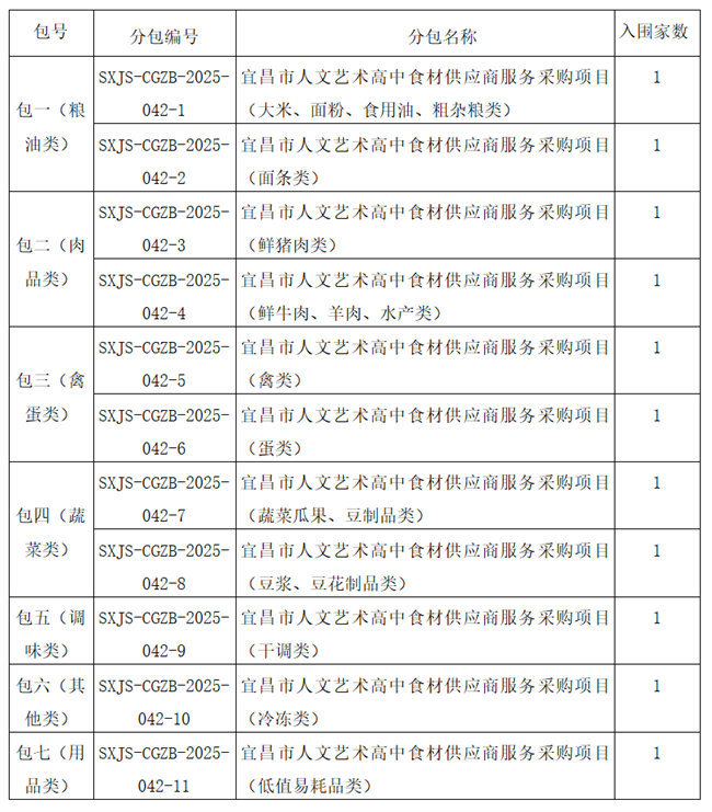 【項目概況】 宜昌市人文藝術高中食材配送供應商服務采購項目的潛在供應商應在宜昌市發(fā)展大道57-6號三峽云計算大廈A座20樓獲取招標文件,并于2025年7月23日09點00分(北京時間)前遞交投標文件。 一、項目基本情況 1.項目編號:SXJS-CGZB-2025-042 2.項目名稱:宜昌市人文藝術高中食材配送供應商服務采購項目 3.采購方式:公開招標 4.采購需求:宜昌市人文藝術高中食材配送供應商服務采購項目共11個分包,具體分包如下,每個分包公開遴選一家供應商(備選兩名排名第二、第三的供應商)為宜昌市人文藝術高中提供為期三年的物資供應。(詳見招標文件第三章采購需求)