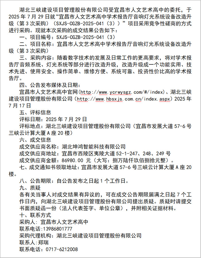 宜昌市人文藝術(shù)高中學(xué)術(shù)報(bào)告廳音響燈光系統(tǒng)設(shè)備改造升級(第3次采購)成交結(jié)果公告 |