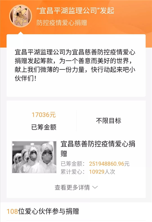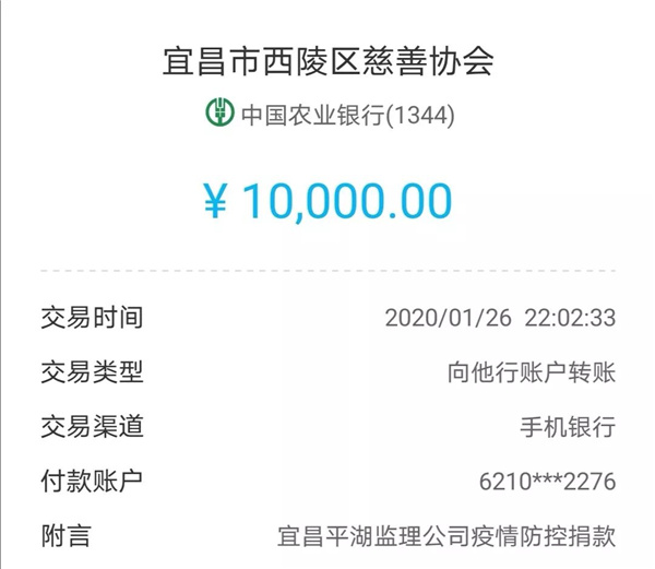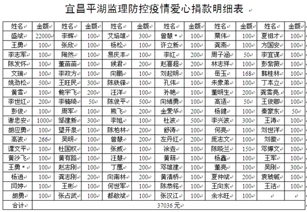 突發(fā)的新型冠狀病毒感染肺炎疫情牽動著黨中央和全國人民的心,全國各地已啟動突發(fā)公共衛(wèi)生事件Ⅰ級響應(yīng),各部門、各行業(yè)積極行動,投身到抗擊疫情的第一線。團結(jié)一心、眾志成城,堅定不移打贏這場無硝煙的抗疫之戰(zhàn),已全面進入決戰(zhàn)時段。 春風(fēng)楊柳萬千條,六億神州盡舜堯”,抗擊疫情平湖有責(zé)。我們雖不是白衣天使,不能做到義無反顧奔赴前線抗擊疫情,但我們能夠情系前線,獻(xiàn)出我們的一份愛。公司黨支部號召全體員工弘揚守望相助精神,積極行動捐款援助,用善舉彰顯平湖監(jiān)理人的責(zé)任擔(dān)當(dāng),同呼吸、共命運、心連心,為決勝疫情做出積極的貢獻(xiàn)! 由于疫情嚴(yán)重,公司取消節(jié)后面簽報到,用愛國捐款的方式,在堅定支持抗擊疫情中報到。以信念備戰(zhàn),用愛心參與,為勝利助力! 2月8日我公司黨支部發(fā)起的愛心捐款,短短3個小時,108位同事踴躍參與,奉獻(xiàn)善款17036元。加上公司總經(jīng)理1月26日捐款10000元、1月28日捐款10000元,我公司參與抗疫共計捐助37036元。愛心還將持續(xù)。