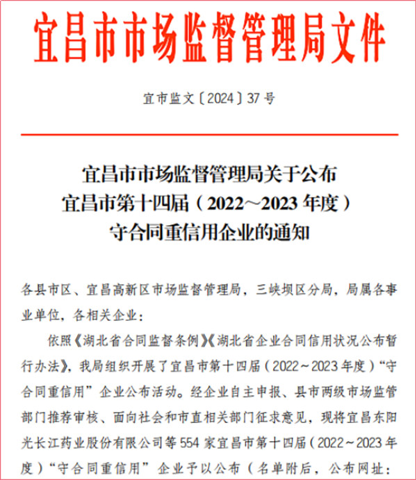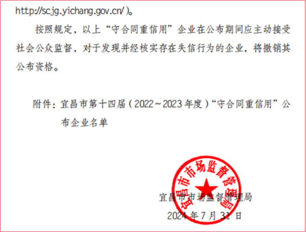 近日,在湖北省市場監(jiān)督管理局和宜昌市市場監(jiān)督管理局公布的湖北省第十七屆 (2022—2023年度)“守合同重信用”企業(yè)及宜昌市第十四屆(2022-2023年度)“守合同重信用”企業(yè)名單中,我公司再度被評為省、市兩級“守合同重信用”企業(yè),這是我公司連續(xù)第九年蟬聯(lián)湖北省省級“守合同重信用企業(yè)”榮譽稱號。