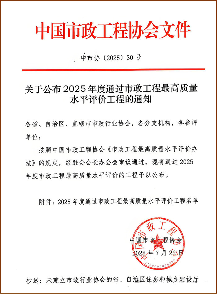 熱烈祝賀我公司監(jiān)理的三峽快速路互通立交-花溪路節(jié)點(diǎn)互通工程順利通過(guò)2025年度全國(guó)市政工程最高質(zhì)量水平評(píng)價(jià)!該獎(jiǎng)項(xiàng)由中國(guó)市政工程協(xié)會(huì)組織評(píng)選,代表我國(guó)市政工程行業(yè)質(zhì)量管理的最高水準(zhǔn),與建筑領(lǐng)域"魯班獎(jiǎng)"齊名,是對(duì)項(xiàng)目卓越品質(zhì)的權(quán)威認(rèn)可。